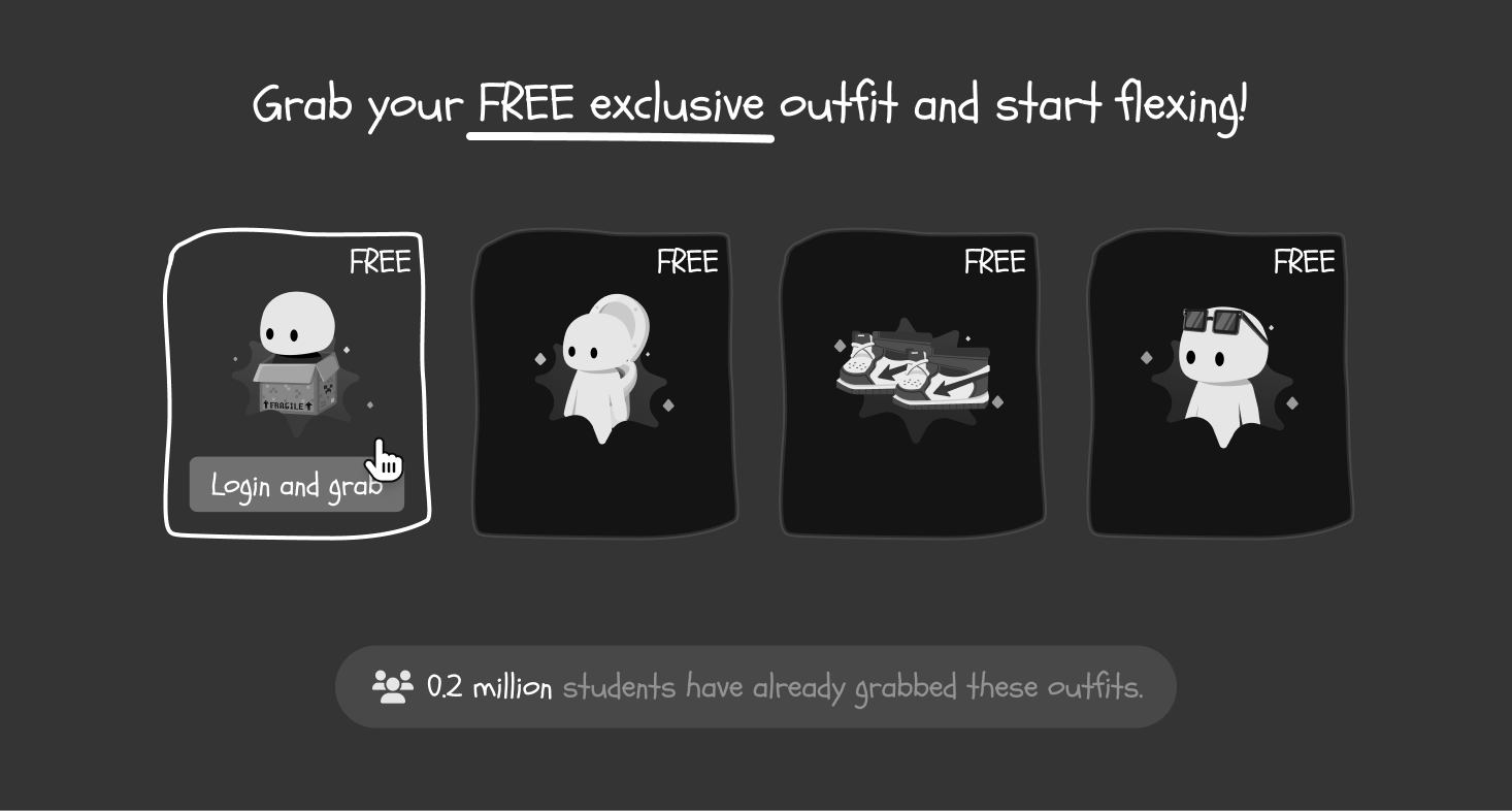 Students can logout and grab a new FREE outfit everytime. Leads to supply problem.